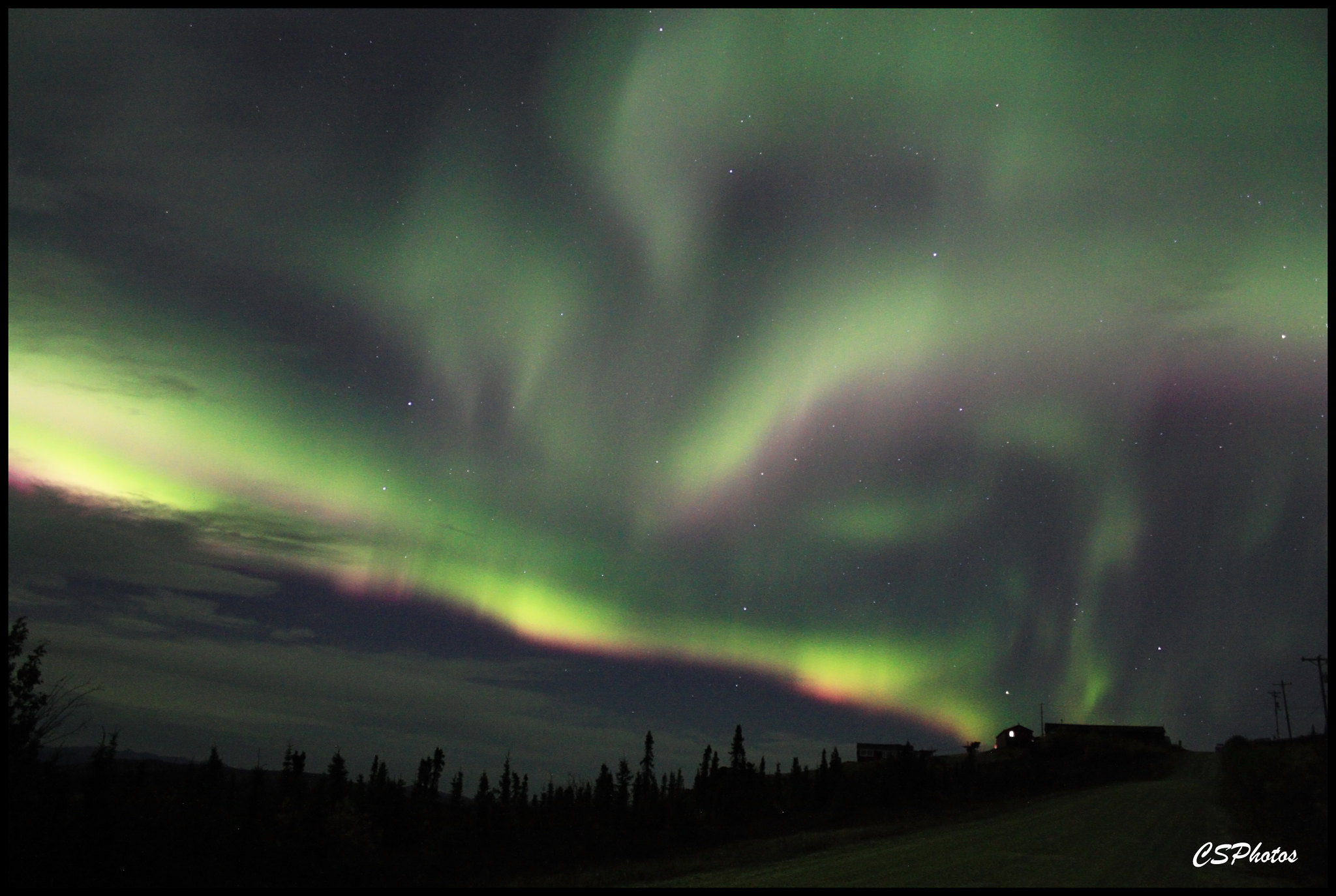 Deciding to be safe, we got back into our rental car and drove 25+ miles north of Fairbanks. We ended up finding a remote spot on a dirt road and proceeded to wait. While it wasn’t frigid, it was certainly cold (even though we were wearing winter clothing). The waiting game dragged well into midnight and we both dozed in and out. It wasn’t until after 1:00 AM that my brother looked out the window and thought he saw something changing in the sky. Sure enough, the night sky began to erupt just minutes later.